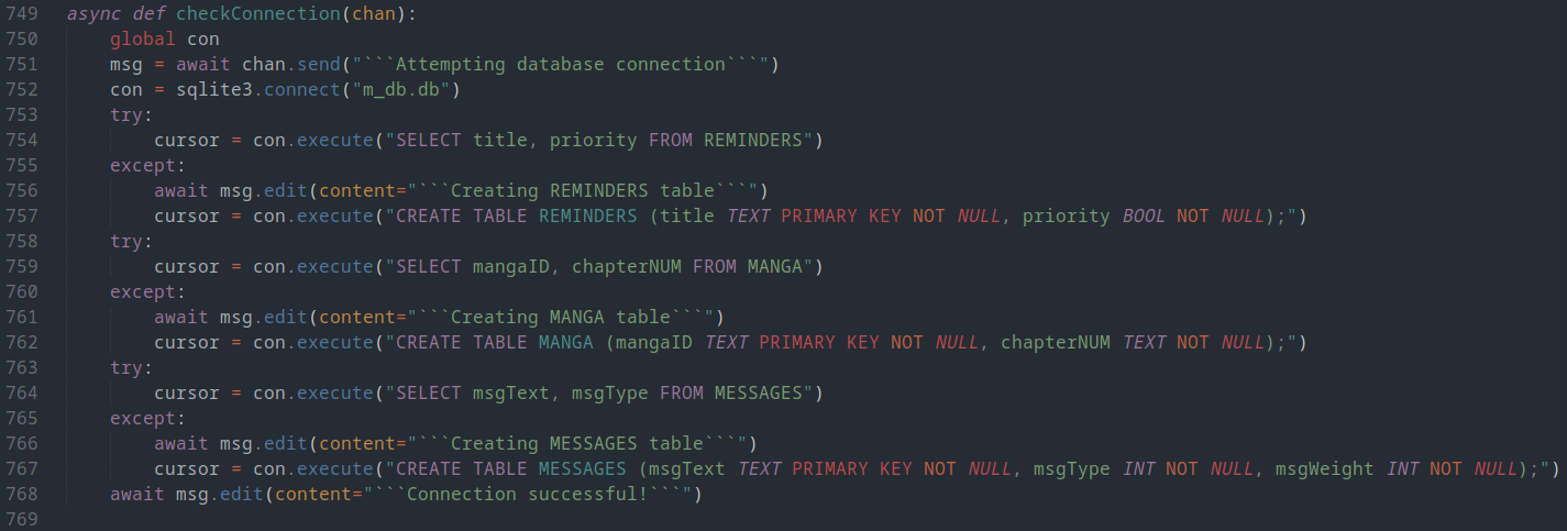 This function is run only once immediately once MiniBot is ready, and checks whether there is a m_db.db file. If there is, MiniBot checks whether all of the necessary tables are built and correct, and builds them if they are not. Then, MiniBot sets the connection to a global variable to be used by any function.