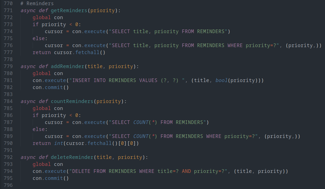 These four functions are extremely simple, as they add or remove reminders from the database, returns all reminders of a specific priority, or returns the amount of reminders in the database respectively
