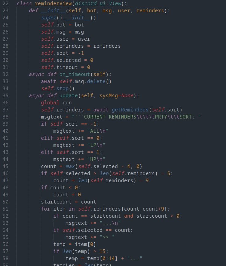 This class is super necessary to run, and simple to explain, as the Timer class is the class that instantiates all of the timers MiniBot requires to send its reminders and updates. As inputs, the timer class takes the time until the timer runs, the task it will complete when it does, and any necessary arguments for the task.
