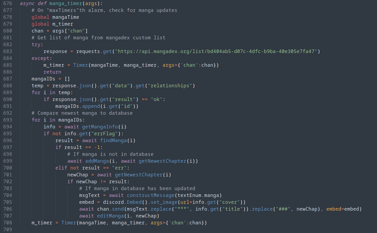 This function works similarly to notify_timer(), but instead of sending reminders, this timer checks whether any manga in a specific MangaList on MangaDex has been updated. After comparing the list to the manga in its database, MiniBot sends a message to notify the user or removes the manga from its database if a manga has been updated or removed from the MangaList respectively.