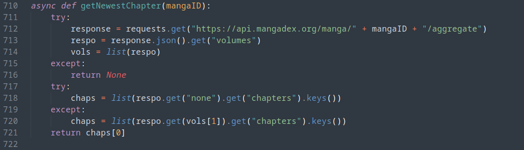 This function sends a request to the mangadex api, and returns the newest chapter number of the specified manga