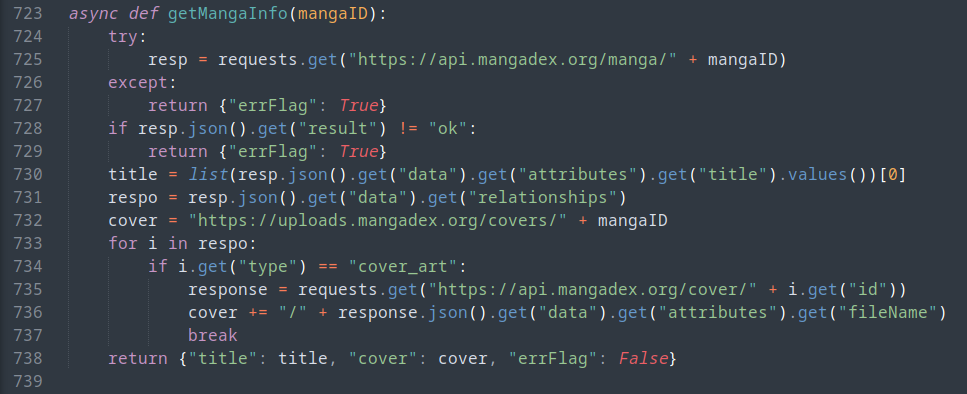 This function is called whenever manga_timer() finds a new chapter for a manga. MiniBot uses this function to get the title and the cover for the message it will send in `#manga-updates`