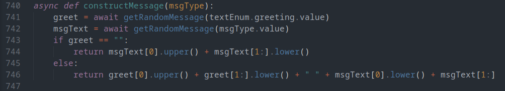 This simple function is called by both timers, and uses getRandomMessage() to add any greeting to any message template to construct the message that will be sent to the user