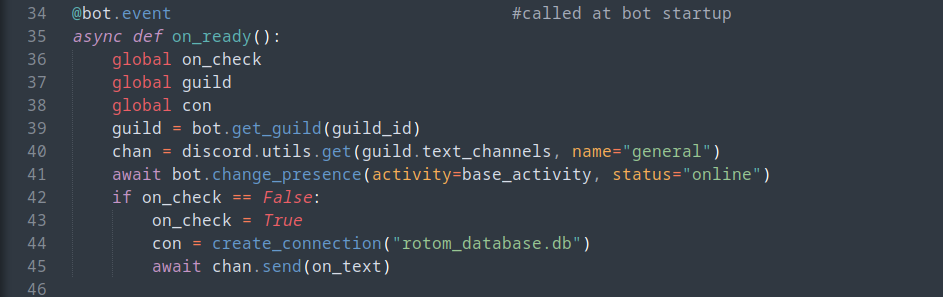 This function runs whenever the bot connects or reconnects to the discord api and "is ready" to begin functioning. First, the bot assigns the `guild` global variable, which will be frequently used by many commands. The bot then sets up the presence it will use on the Discord sidebar, and check whether it is being run for the first time. If it is, it creates the connection with the database and sets it to the global variable con, and sends a message in the `#general` channel of the Discord server.