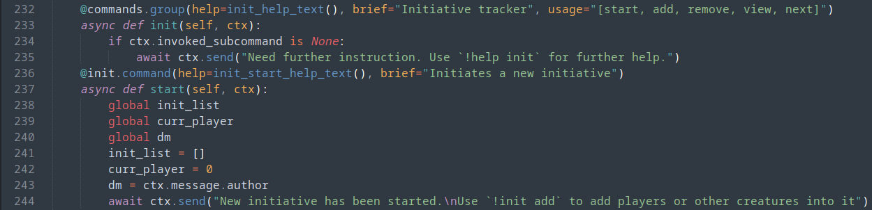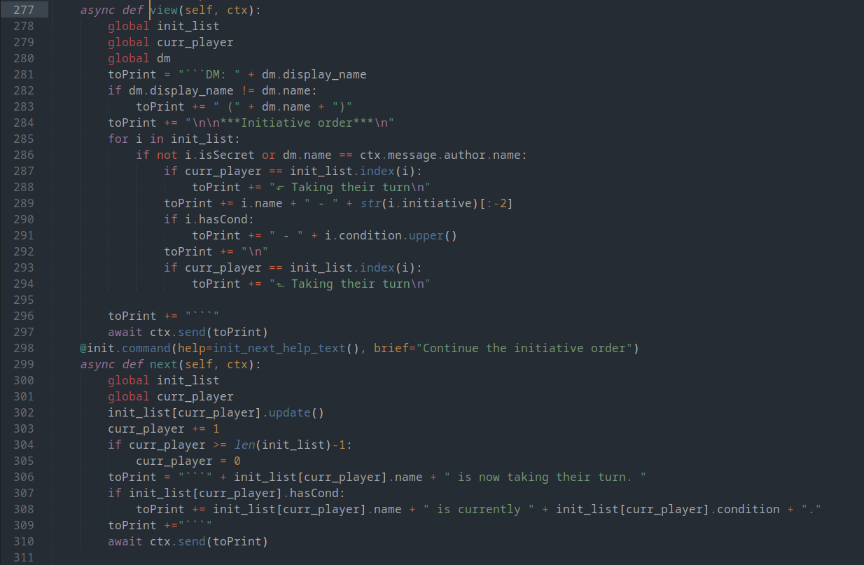 The view command prints out the entire virtual initiative order for players and/or DMs to view, and depending on the user, includes or excludes hidden characters. Continuing beyond the first character in the initiative tracker is handled by the next command, which is essential for the condition tracker to function.