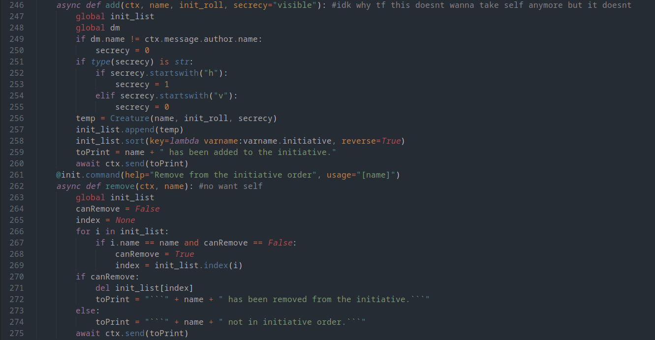 These commands are called by players and DMs who want to add characters to the virtual initiative. The character's name should be inputted, alongside their initiative roll (with DEX modifier as decimal for accuracy), and an optional boolian flag that handles hiding characters from the players.
