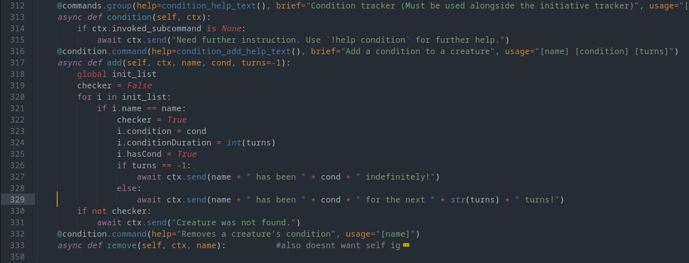 These commands add and remove any condition with a specified duration applied to a specific character. The condition tracker as a whole works in conjunction with the initiative tracker.