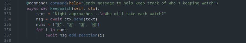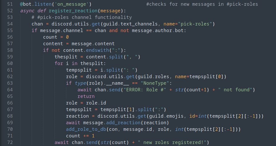 This function pulls double duty, as the first half of it pictured above is related to the role assignment functions of the bot, while the second half relates to the server suggestions function. Essentially, this half listens to every message send in the `#pick-roles` channel, and automatically reacts to that message with every emote in the message.