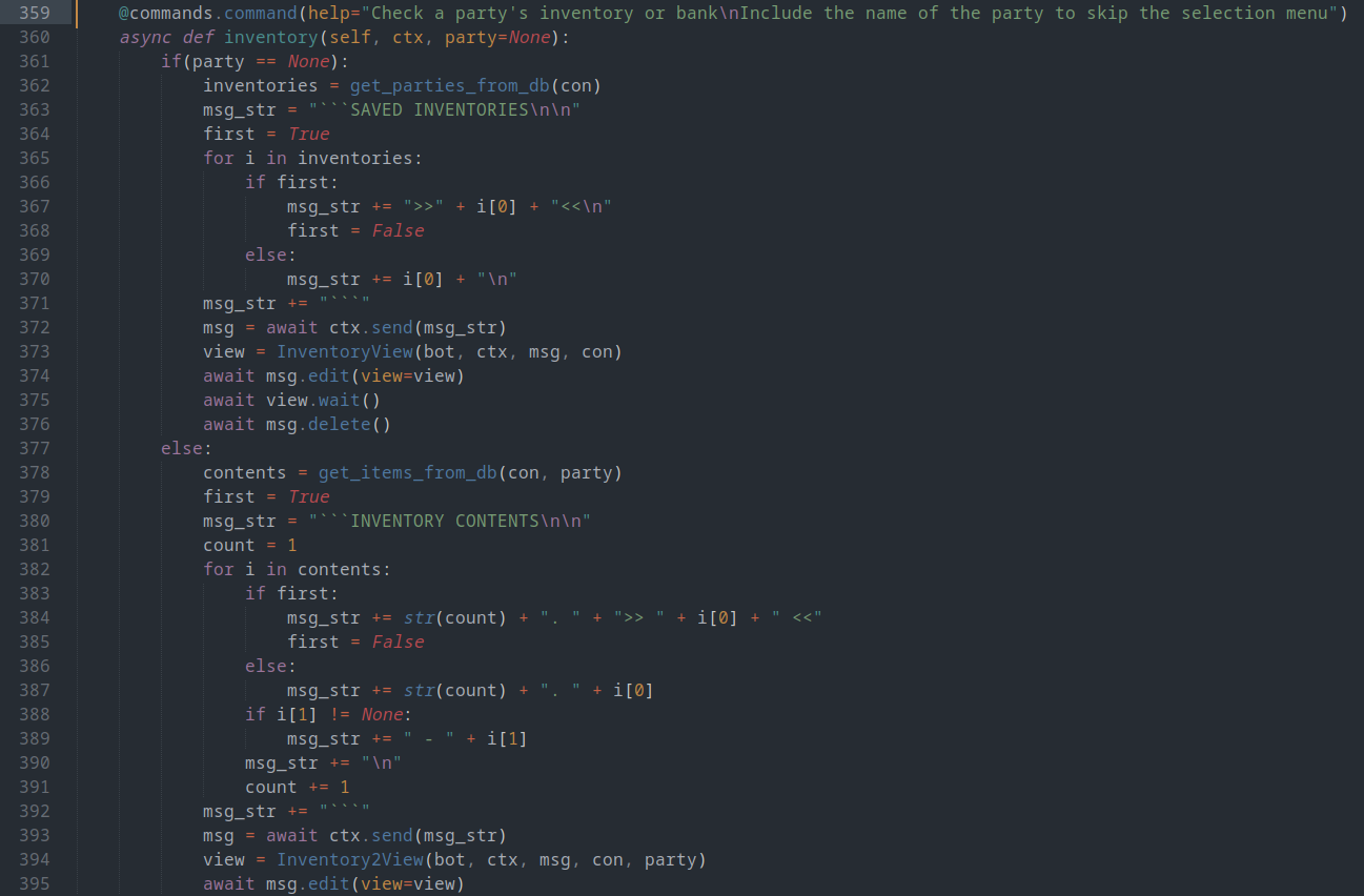 This command brings up the inventory menu, which the bot sends in a message. This menu can be used to keep track of character or party inventories, including the money separately from their stuff.