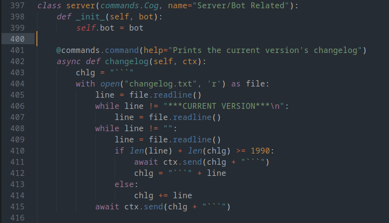 Simply this command sends a message in the server containing either the entire changelog for the bot, or just for the most recent update.