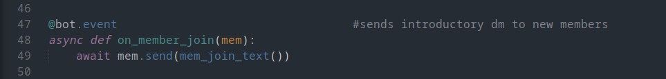 This is an extremely simple event handler, where RotomBot will send an introductory message to any user joining the server for the first time.