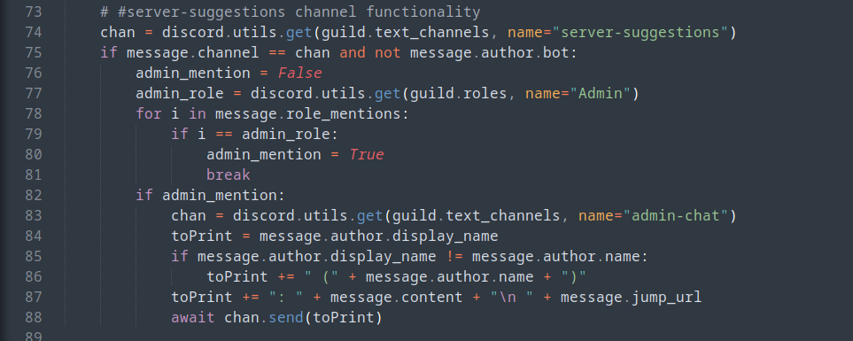 The other half of register_reaction() is somewhat of a misnomer, as it was written way after the role request function of the event listener. If a user sends a message in the `#server-suggestions` channel that mentions the `Admin` role, RotomBot will automatically resend that message in the `#admin-chat` channel to make sure the suggestion gets seen.