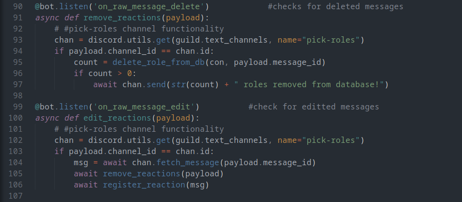 Both of these event listeners work in tandem to help admin's setting up or organizing the `#pick-roles` channel. remove_reactions() is called whenever a message is deleted from the channel, and removes the database entries related to it. edit_reactions is called whenever a message is editted, and ensures that all old database entries are removed, and the new editted entries are added to the database.