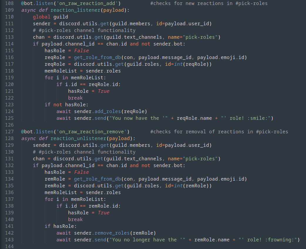 These two listeners are somewhat two sides of the same coin that are the basis of RotomBot's role assignment functionality. While reaction_listener() listens to any reactions in the `#pick-roles` channel and adds the corresponding role to the user, reaction_unlistener() does the opposite, and listens to any reaction removals, and removes the corresponding role from the user.