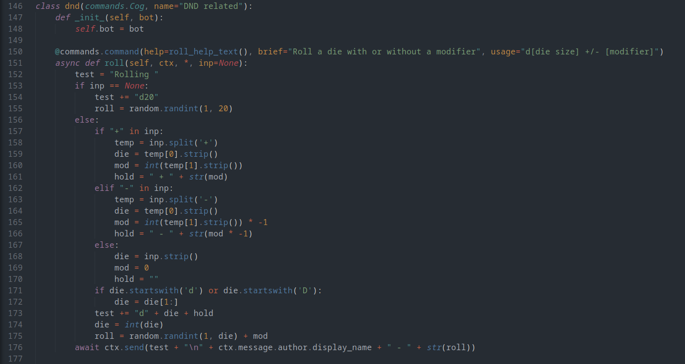 This command is RotomBot's dice roll function which allows any user to roll a die of any size and automatically add any roll modifier. Most of the function is based around string manipulation, as the only input is the command call.