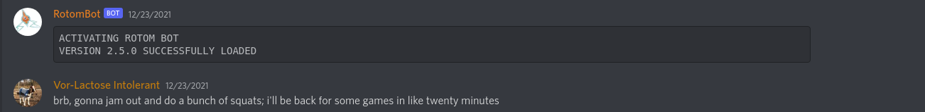 This project's original main purpose was to help familiarize myself with Python, but that project outgrew that goal very quickly. I began working on RotomBot near the beginning of the initial pandemic surge in 2020, so many of its functions came into place due to me and my friends' forced distance from each other.