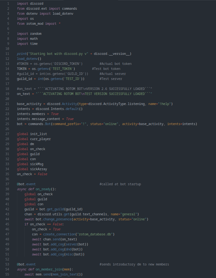 Now, that doesn't mean that RotomBot is written poorly, or that it has few features. RotomBot is a Discord bot written specifically to run on a Raspberry Pi Zero W for a server (or guild if you've ever worked on the Discord api) for me and my friends, and serves many different functions, such as a few tools for playing Dungeons and Dragons online, role assignment, and a few admin functions.